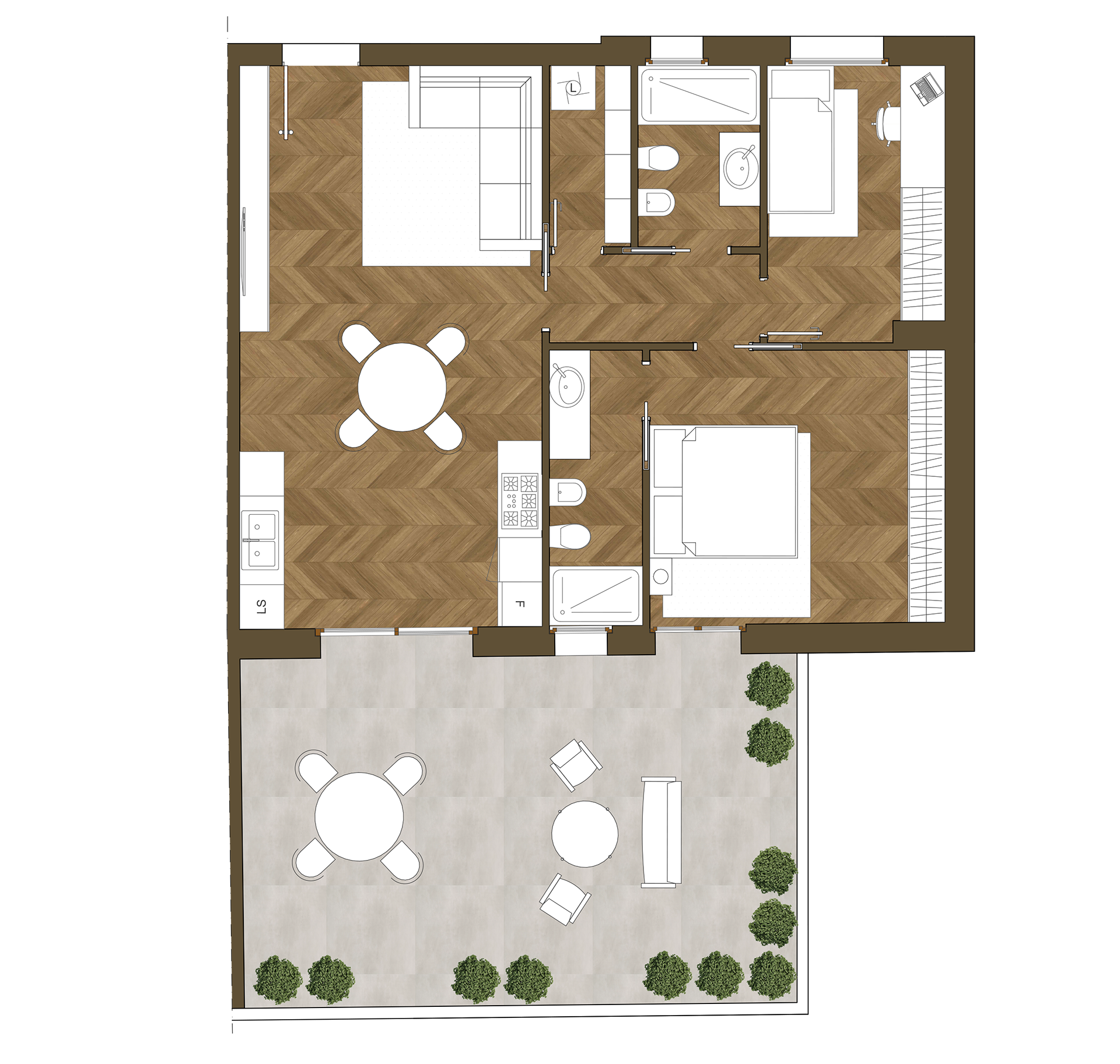 APPARTAMENTO 1C LIVELLO 1 | PIANO TERRA 1C Trilocale 2 Camere 2 Bagni 90 mqsuperfice appartamento lorda 40 mqsuperfice terrazzo lorda 110 mqsuperfice commerciale lorda esposizione Piano Terra Piano 1 Piano 2 Piano 3 Piano 4