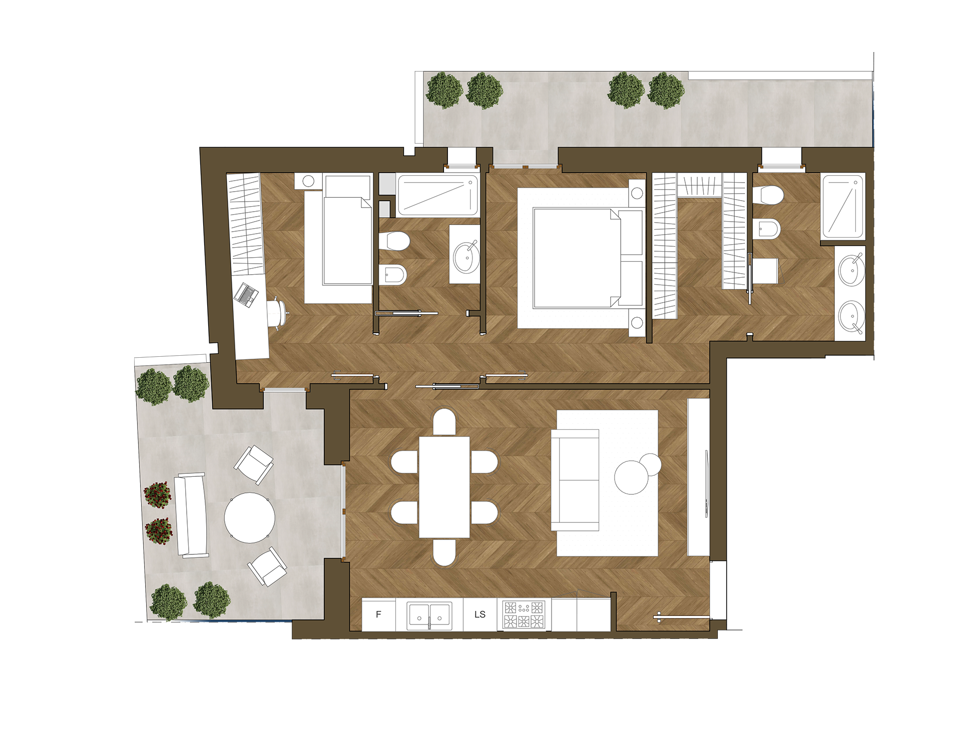 APPARTAMENTO 2A LIVELLO 2 | PIANO PRIMO 2A Trilocale 2 Camere 2 Bagni 85 mqsuperfice appartamento lorda 25 mqsuperfice terrazzo lorda 97,50 mqsuperfice commerciale lorda esposizione Piano Terra Piano 1 Piano 2 Piano 3 Piano 4